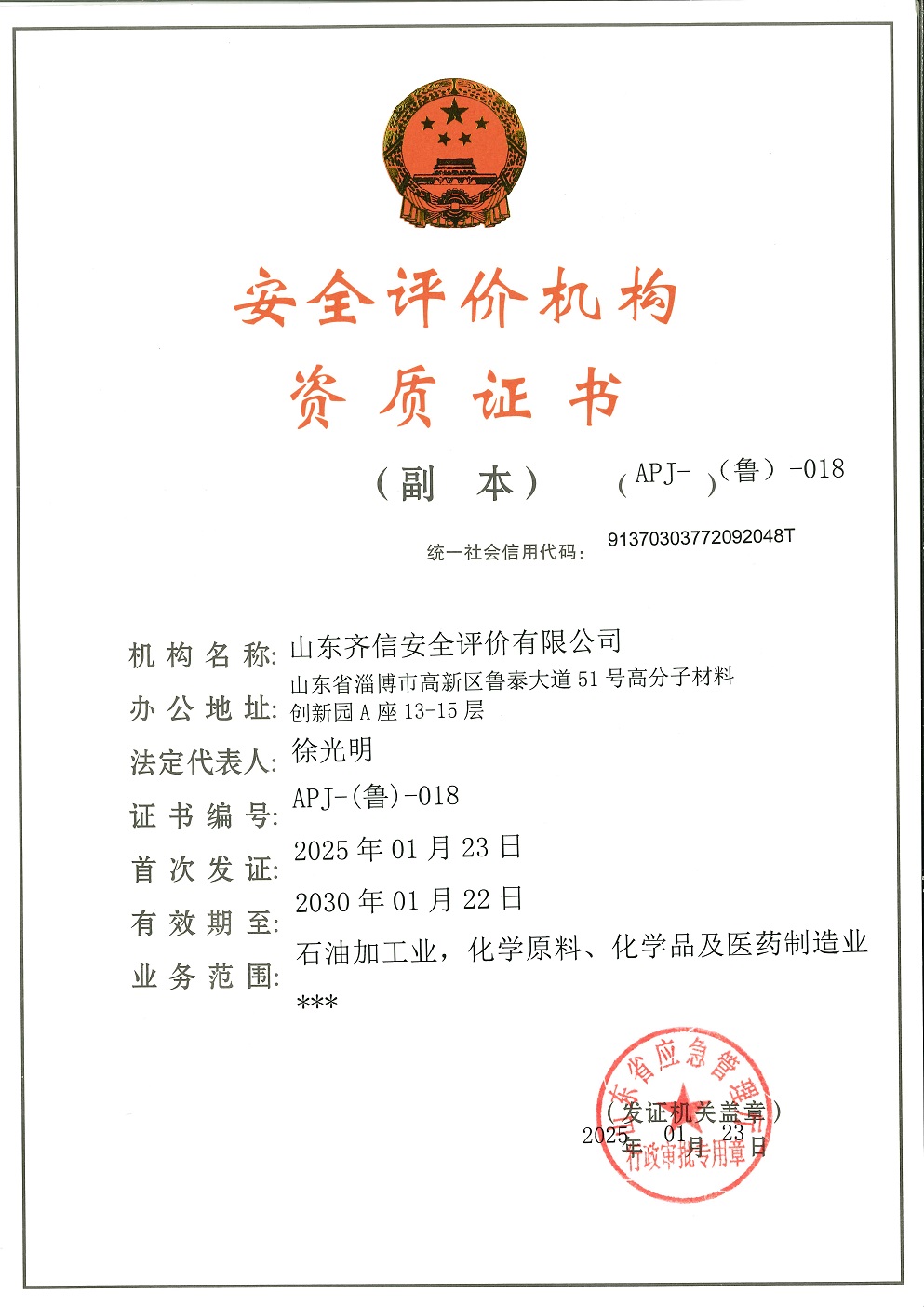 山東齊信安全評價有限公司成立于2005年3月,注冊資本300萬元人民幣,固定資產總值804.8728萬元。法定代表人徐光明,注冊地址及辦公地址位于淄博高新區魯泰大道51號高分子材料創新園A座13-15樓。2005年9月取得安全評價機構乙級資質。自國家應急部1號令實施以來,公司于2020年1月15日取得新安全評價資質,業務范圍包括:陸上油氣管道運輸業;石油加工業,化學原料、化學品及醫藥制造業;金屬冶煉。2018年12月21日取得安全生產標準化二級評審單位,評審范圍:危險化學品、紡織、建材、輕工、冶金、機械。              公司現有人員41人,其中專職安全評價師37人,注冊安全工程師26人,研究員1人、碩士5人、雙學士1人,山東省安全專家庫專家1人、教授級高工1人,高級工程師8人、工程師22人,專職危險化學品標準化評審員、工商貿標準化評審員30人,本科以上學